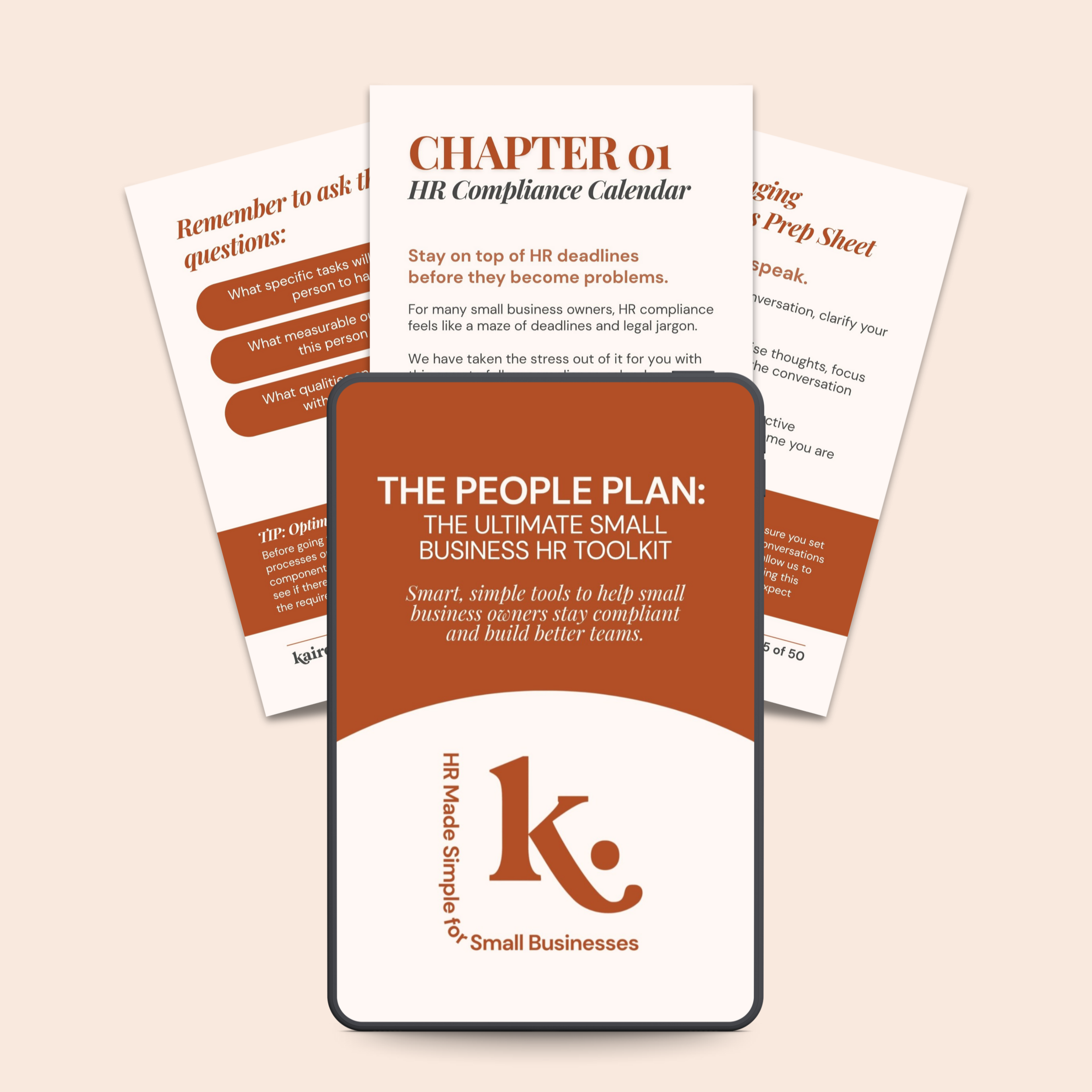 Get this Free HR Toolkit! Whether you're juggling a team of 5 or 50, this practical toolkit gives you the templates, guides, and checklists to get your HR sorted fast. Learn how to stay compliant, keep your best people, and ditch the admin overwhelm.